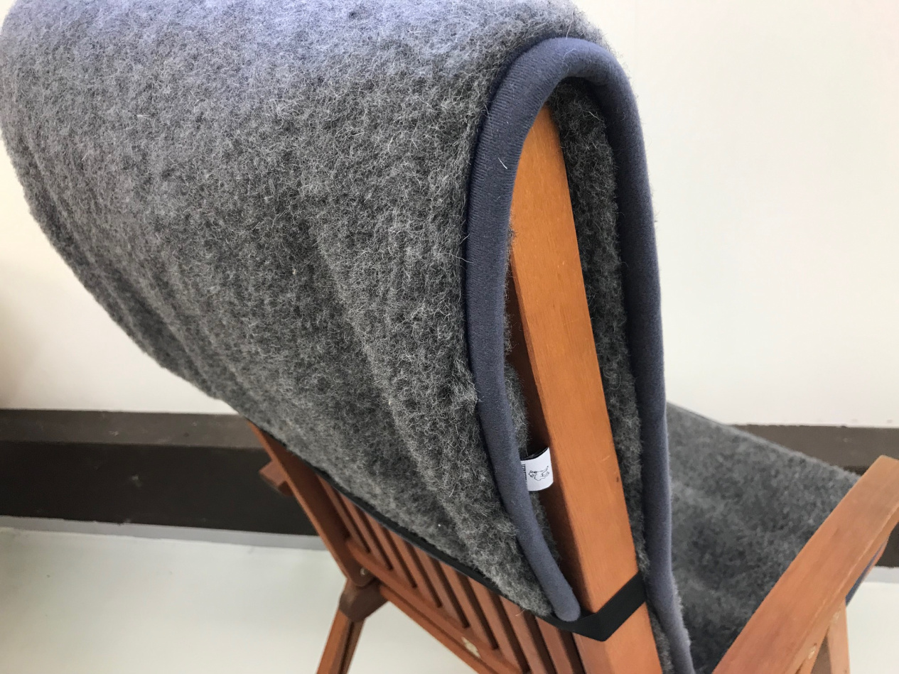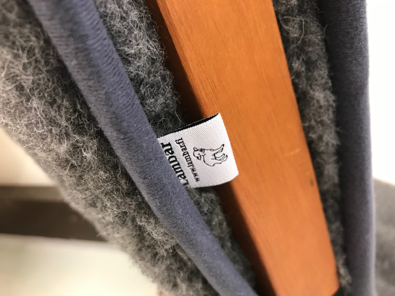 Harmaassa villaistuinpäällisessä on kaksi kerrosta pehmeää ja muhkeaa 100% Merinovillamateriaalia. Toinen puoli on tummanharmaa, toinen vaaleanharmaa. Istuinpäällisessä on kuminauha istuimeen kiinnittämisestä varten. Istuinpäällistä voidaan käyttää molemmin puolin.